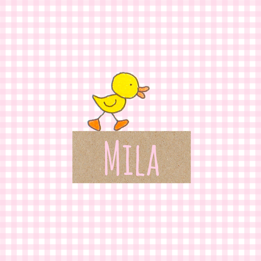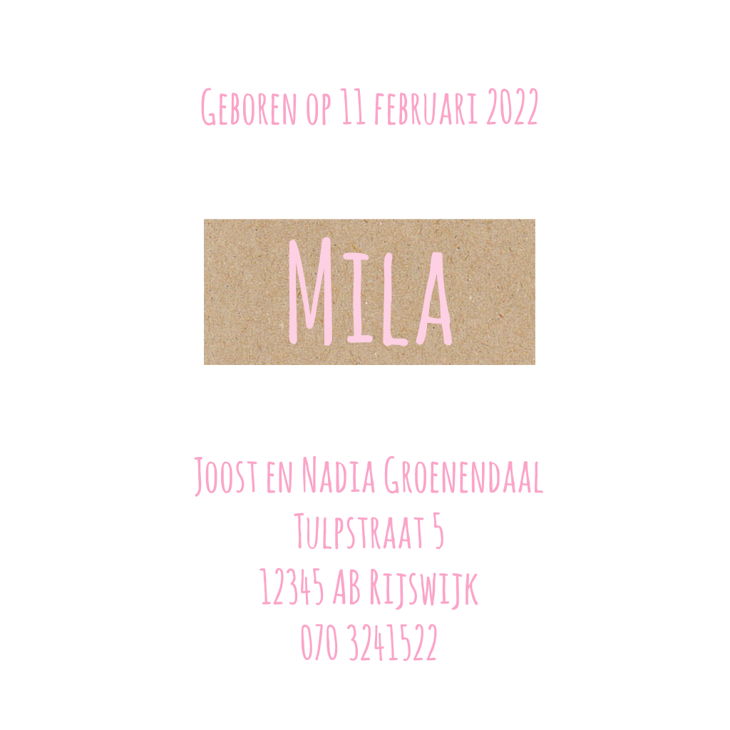 Een lief babykaartje voor een meisje, met een gele eend. Op het bruine vlak is plaats voor de naam van jouw kindje.