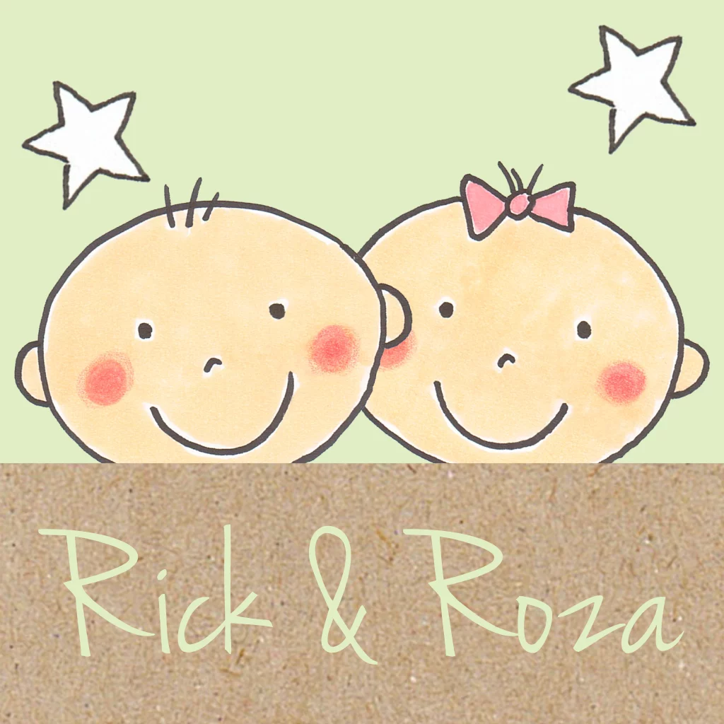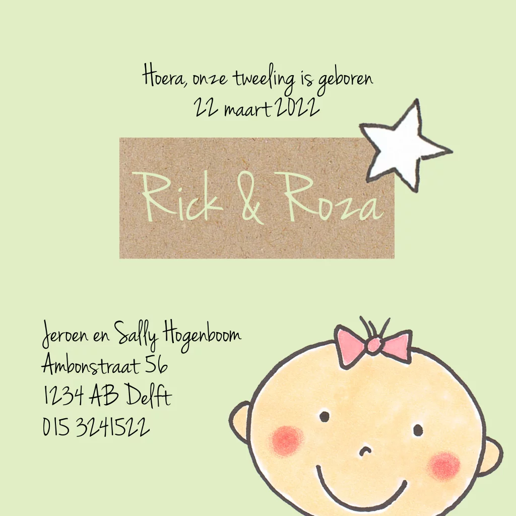 Schattig kaartje voor een tweeling met een getekend jongen en meisje op een mintgroene achtergrond