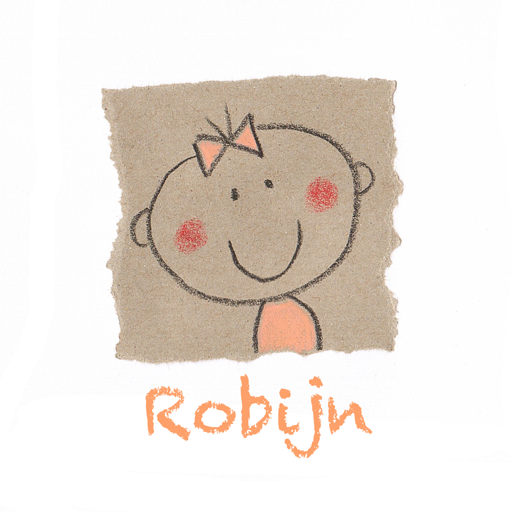 Een vrolijk geboortekaartje met een getekende meisjesbaby op bruin gescheurd papier. Je kunt dit geboortekaartje combineren met gekleurde envelop.