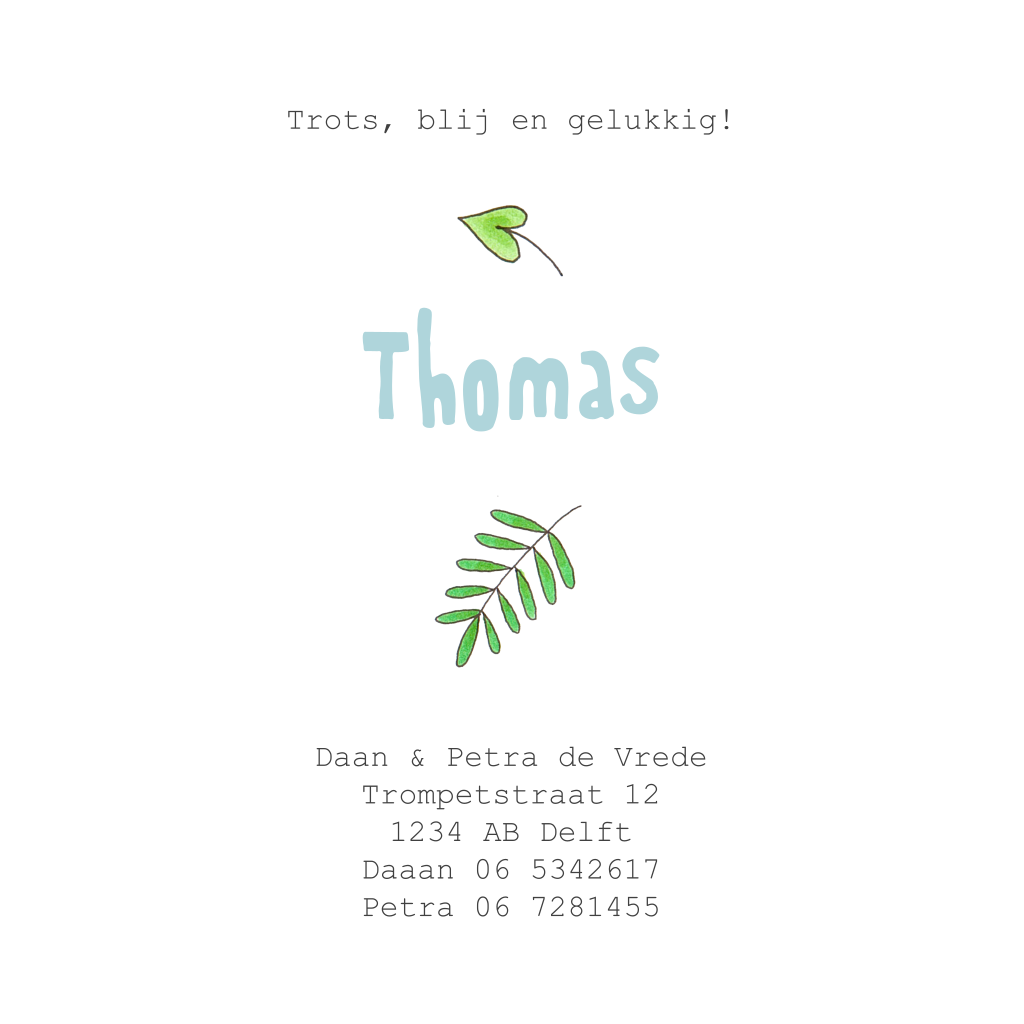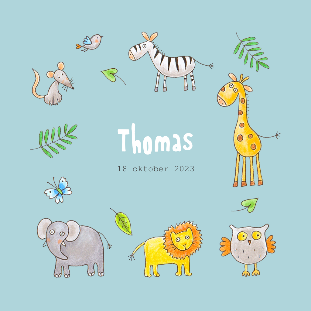 Een vrolijk geboortekaartje voor een jongen met dieren en planten op een blauwe achtergrond. Kleuren en lettertypen kunnen naar wens worden aangepast.