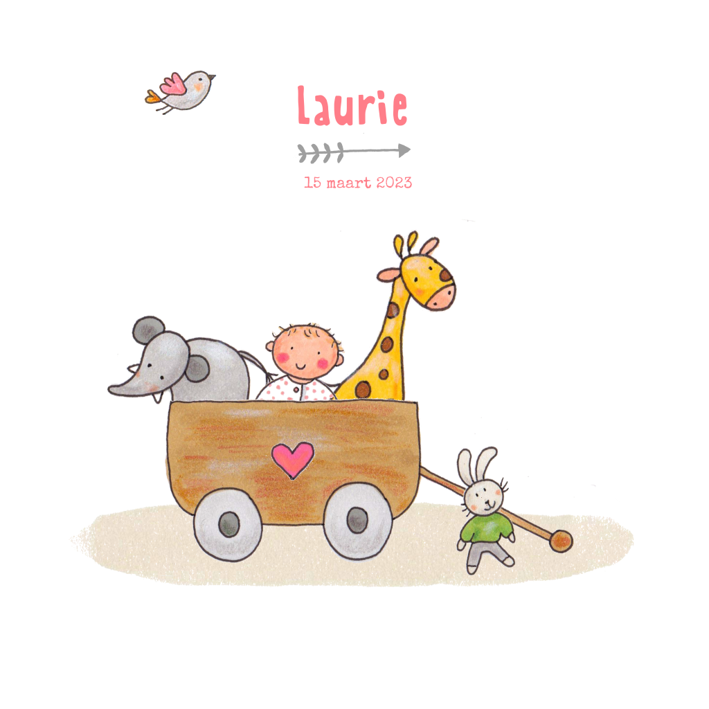 Een lief, getekend kaartje voor je pasgeboren dochtertje met een baby meisje in een bolderkar en schattige knuffels zoals een olifant, giraffe en konijntje.