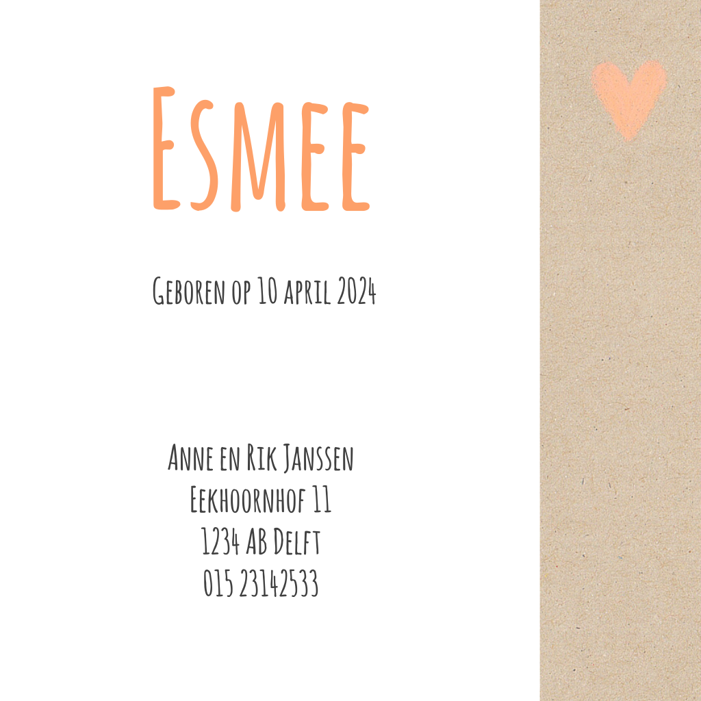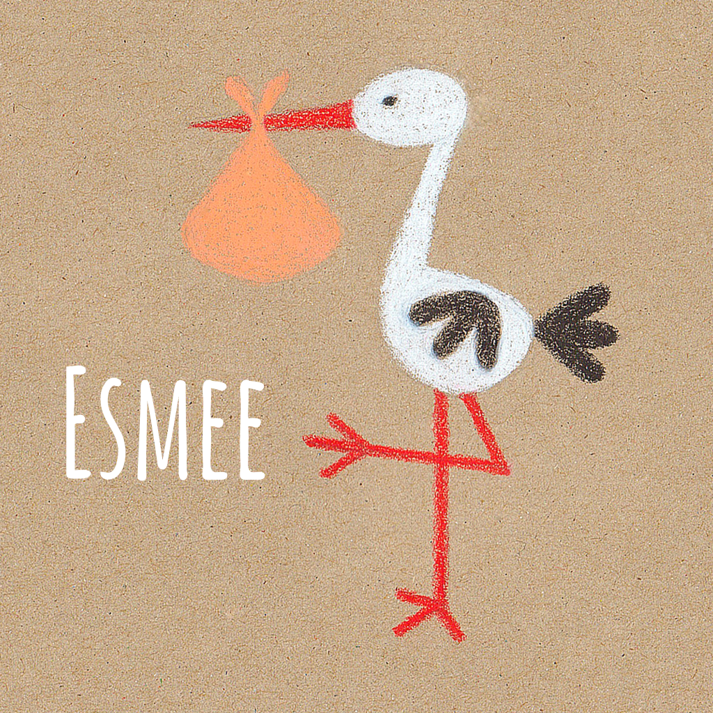 Een origineel geboortekaartje voor een meisje met een ooievaar getekend in krijt, op bruin karton.