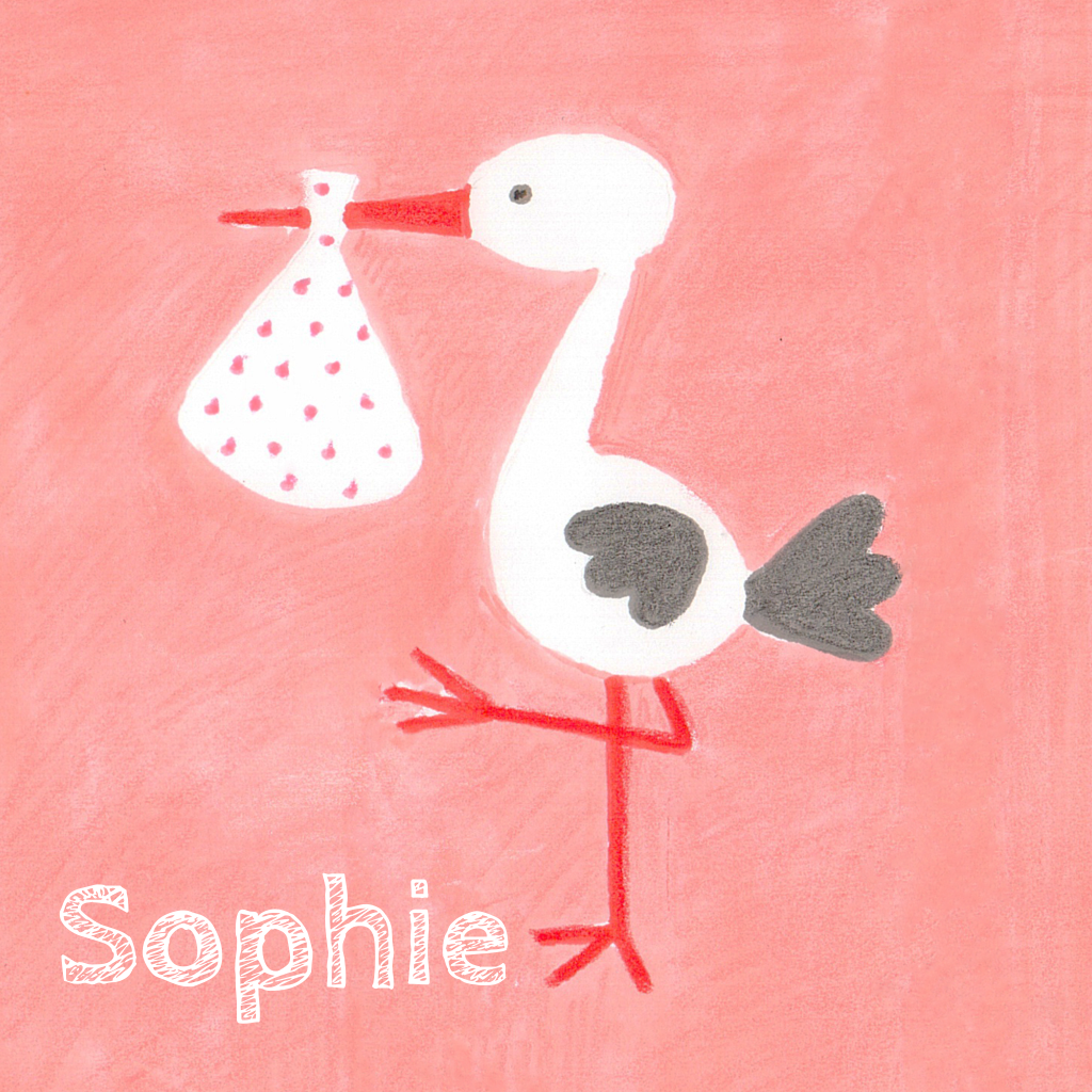 Lief geboortekaartje met ooievaar die een bundeltje met baby vasthoudt. Geboortekaartje in stijlvol oudroze ontwerp. Vertel met dit leuke retro kaartje jullie mooie nieuws.