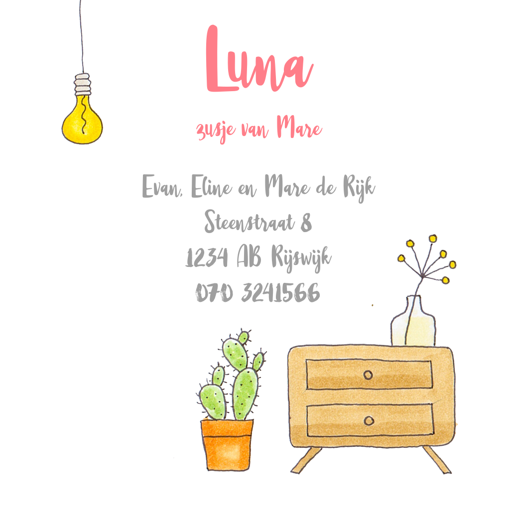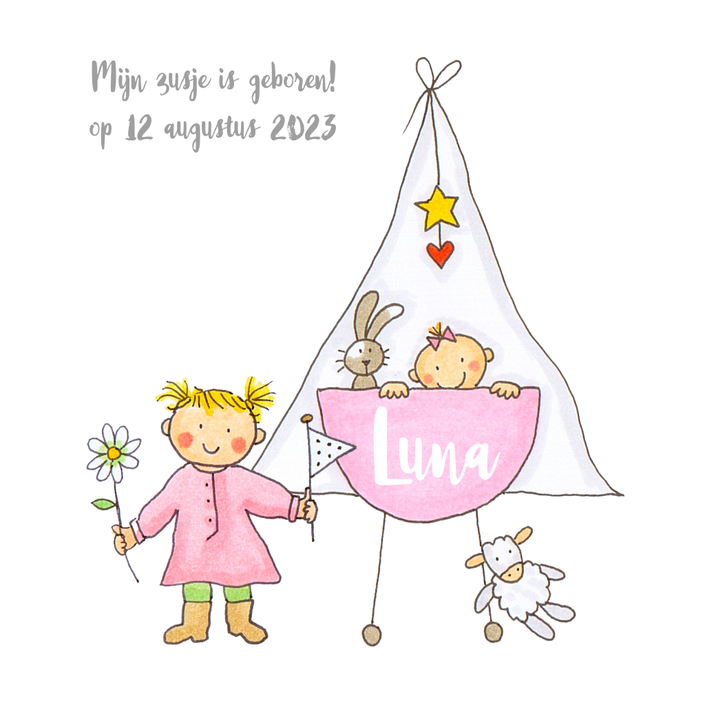 Lief getekend geboortekaartje 2e kindje een baby zusje met grote zus en wieg. Voor een andere gezinssamenstelling kun je contact opnemen met de klantenservice. We helpen je graag. (106)