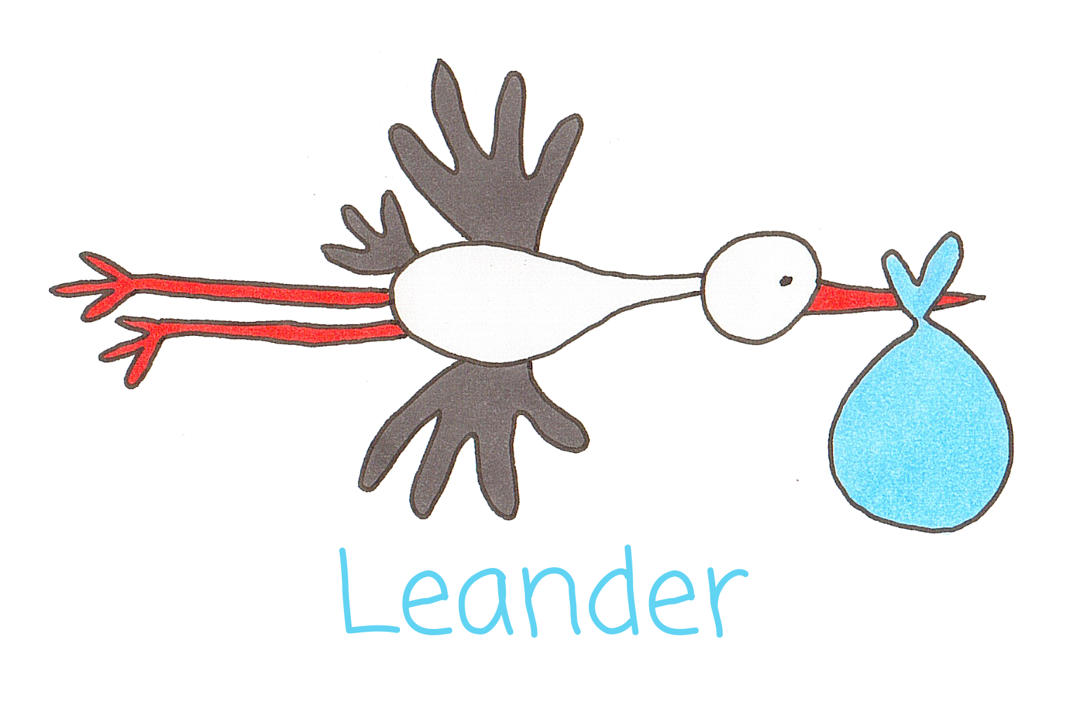 Een vrolijk getekend geboortekaartje voor een jongen met een vliegende ooievaar en een blauwe draagdoek.