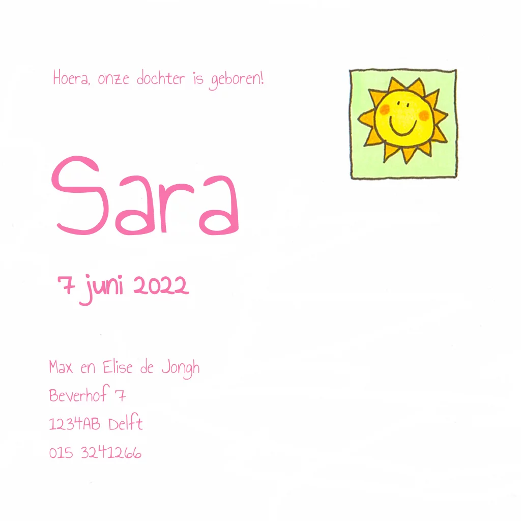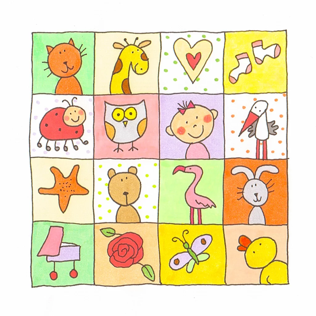 Een lieve geboortekaart met zestien tekeningetjes in felle kleurtjes. Voor meisjes.