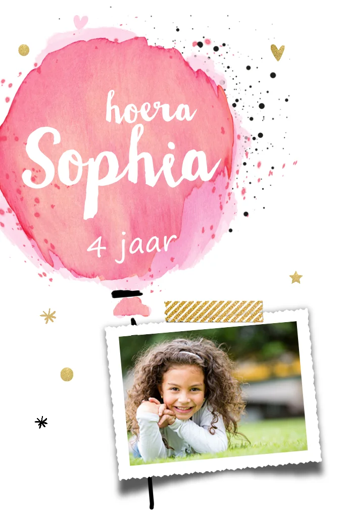 Hippe uitnodiging kinderfeestje met roze ballon en foto.