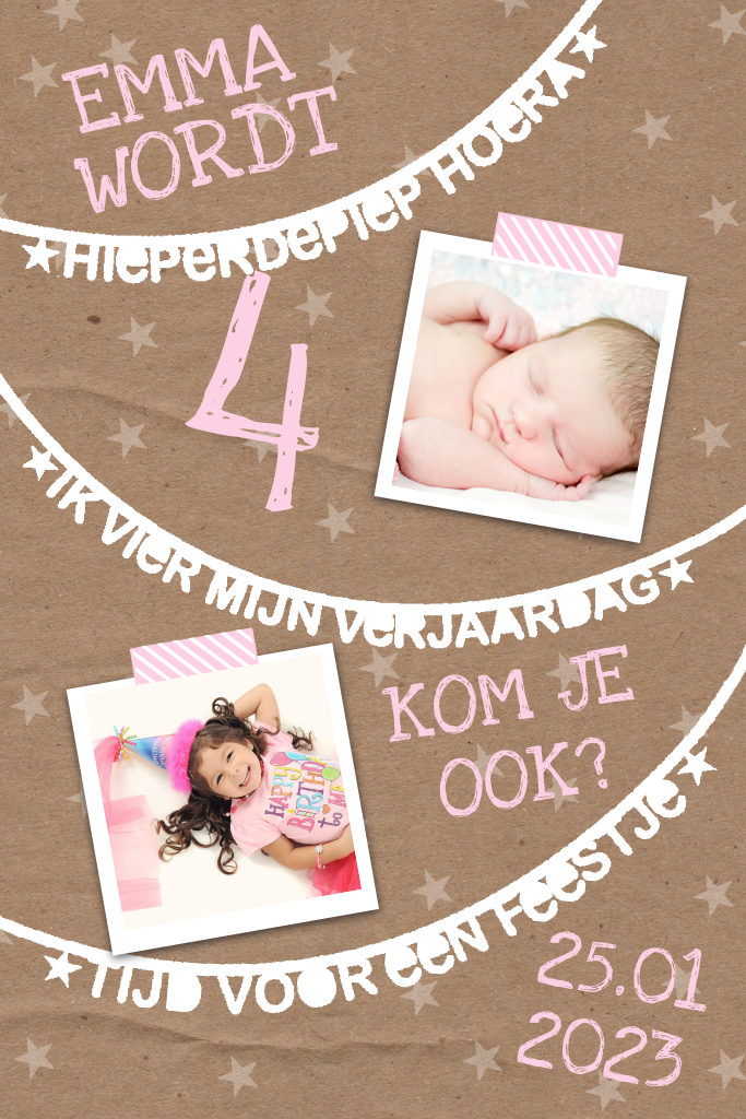 Met een foto van je dochter toen ze net geboren was en een foto van hoe ze er nu uitziet, laat je je familie, vrienden en de vriendjes van je meisje weten dat ze 4 wordt. Vrolijk, met karton, slingers en sterretjes.