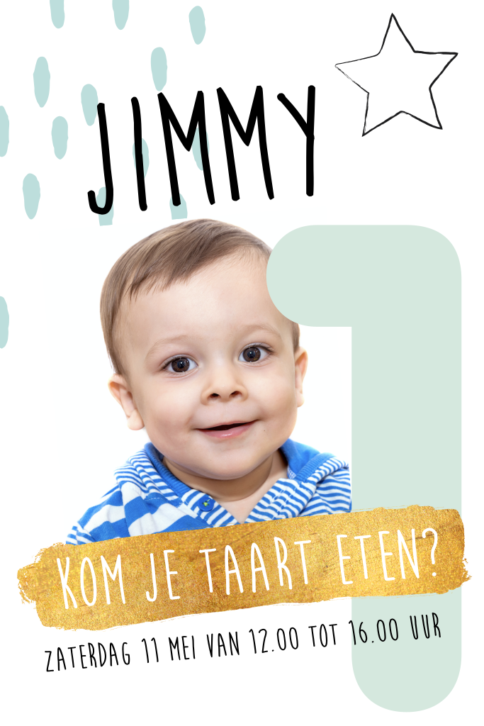 Hippe uitnodiging voor de verjaardag van een jongen met mint en goud. Plaats een eigen foto in het kaartje.