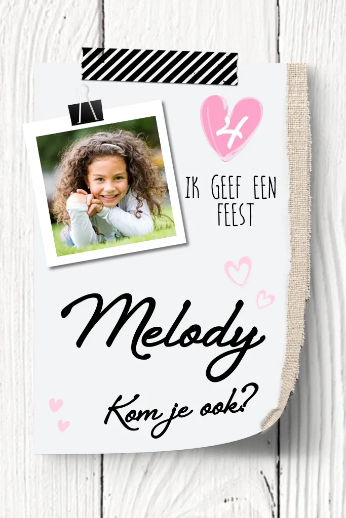 Hippe uitnodiging kinderfeestje meisje met hout patroon en ruimte voor een eigen foto.