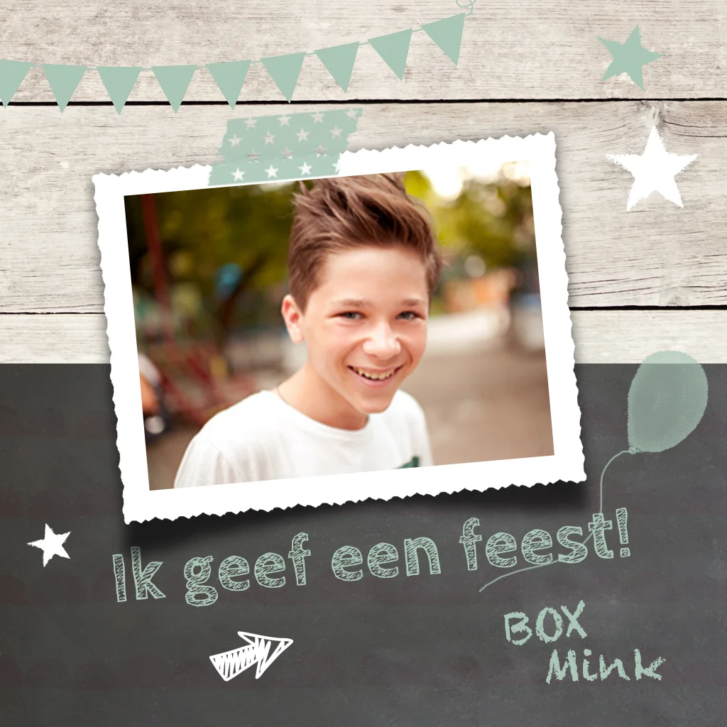 Uitnodiging kinderfeestje met eigen foto en krijtbord.