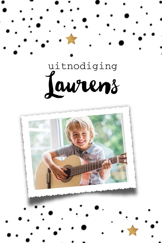 Uitnodiging verjaardag met hippe stippen en ruimte voor een eigen foto.