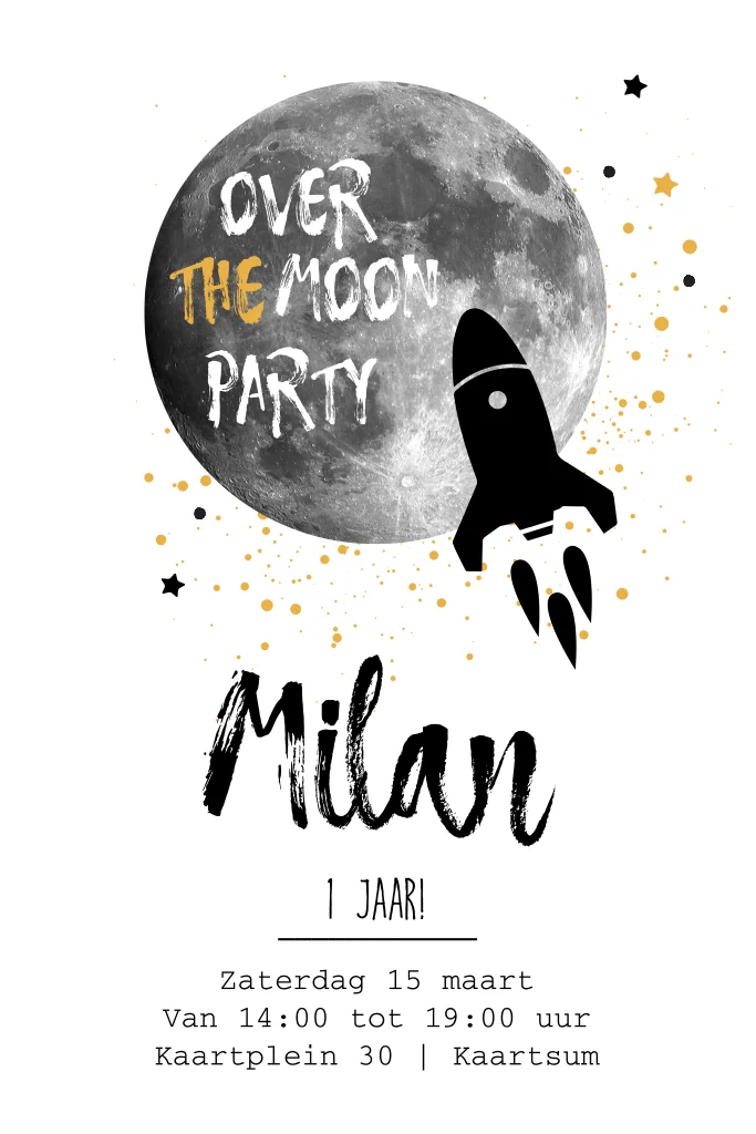 Hippe uitnodiging 1ste verjaardag jongetje met maan en raket.