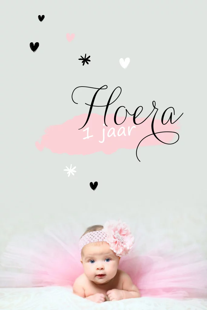 Foto uitnodiging kinderfeestje meisje 1 jaar met roze harten.