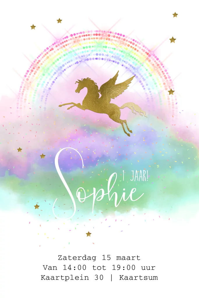 Lieve uitnodiging 1ste verjaardag eenhoorn en regenboog