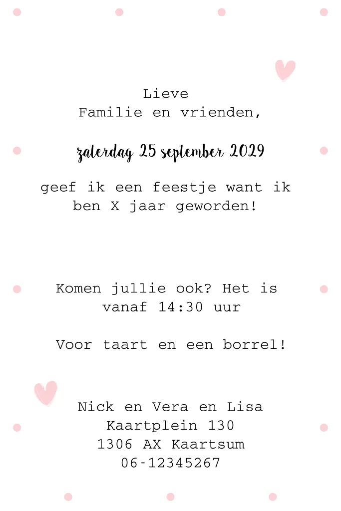 Uitnodiging kinderfeestje meisje met lieve roze hartjes en stipjes.