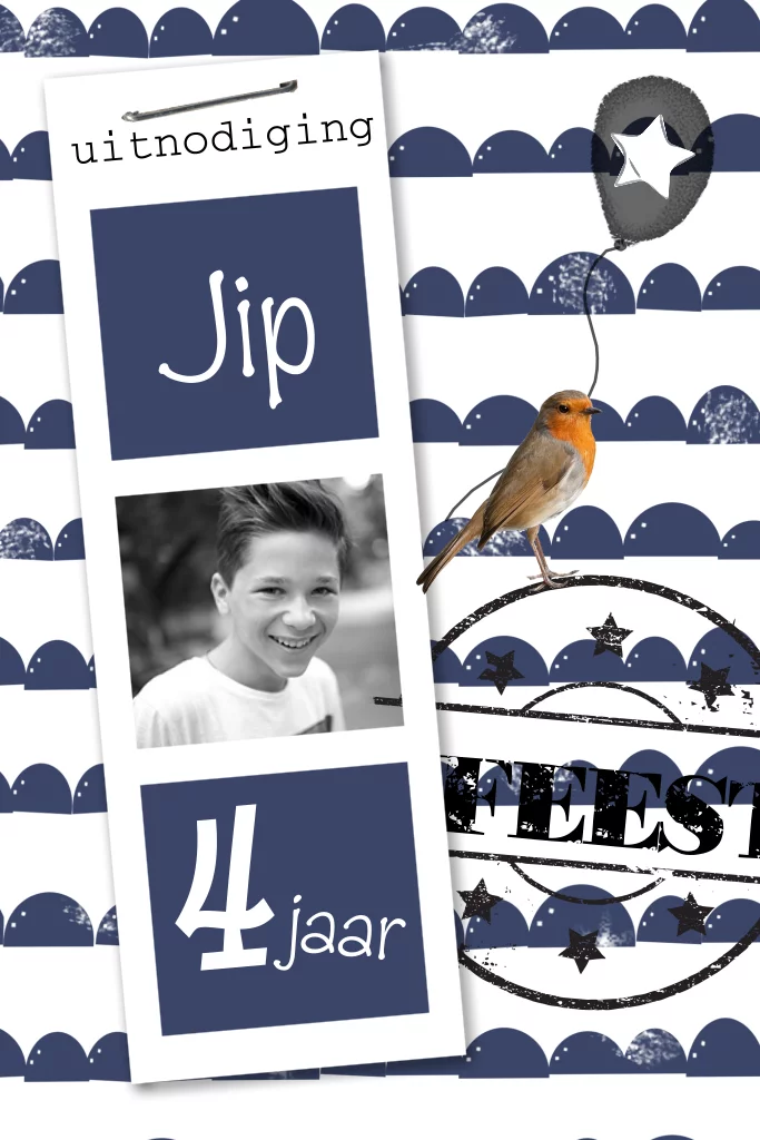 Blauwe uitnodiging kinderfeestje jongen met foto strip en vogel.