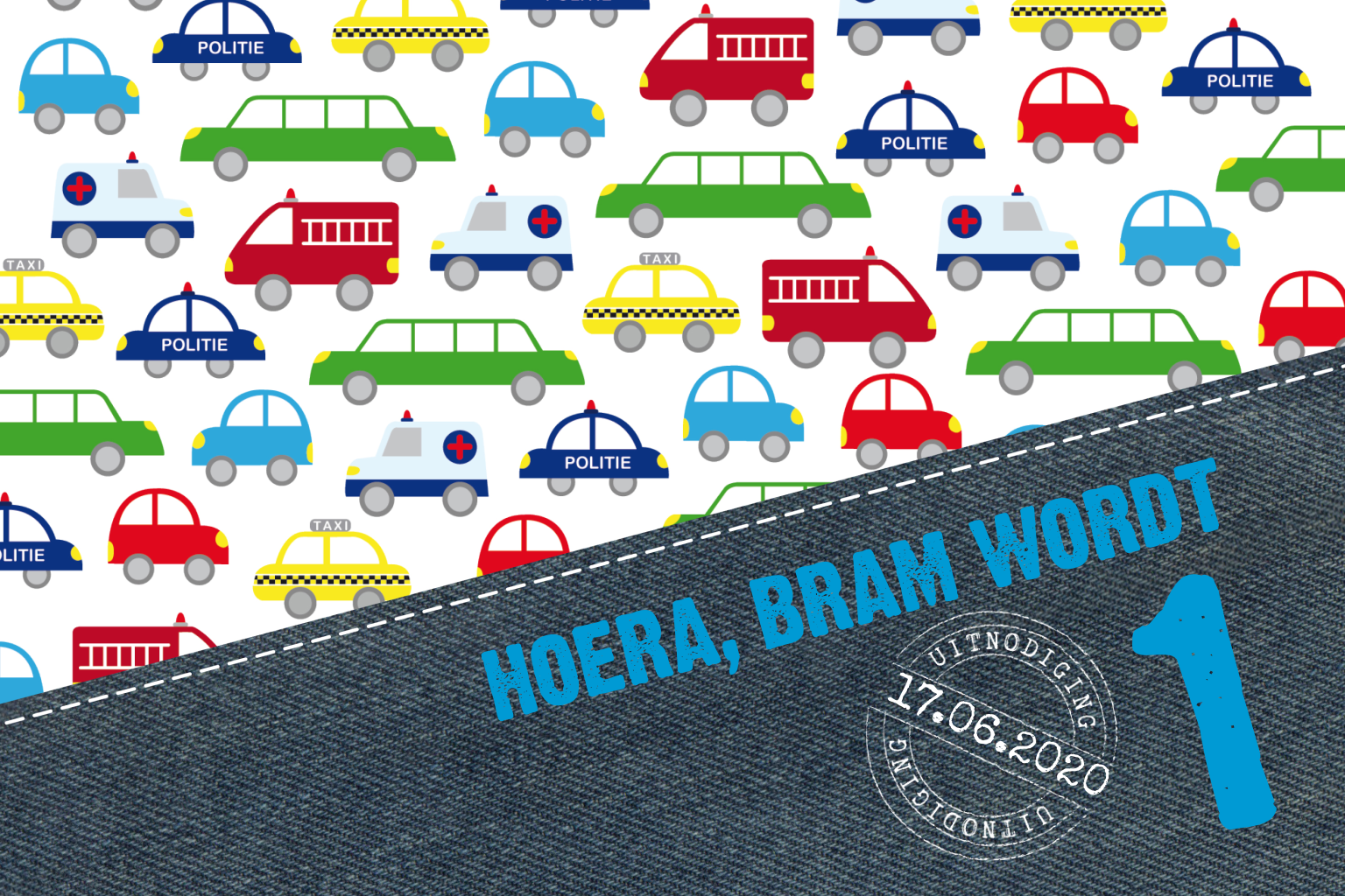 Een leuke, stoere uitnodiging met auto's en jeansprint voor een kinderfeestje! Pas zelf de teksten en de leeftijd aan.