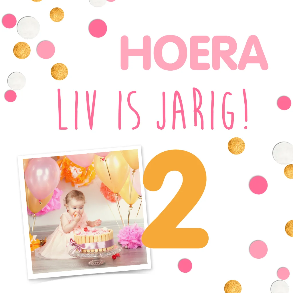 Lieve uitnodiging voor het kinderfeestje van een lief meisje dat twee jaar oud wordt. Met feestelijke roze en gouden confetti. Plaats op de voorkant een mooie foto van de kleine meid.