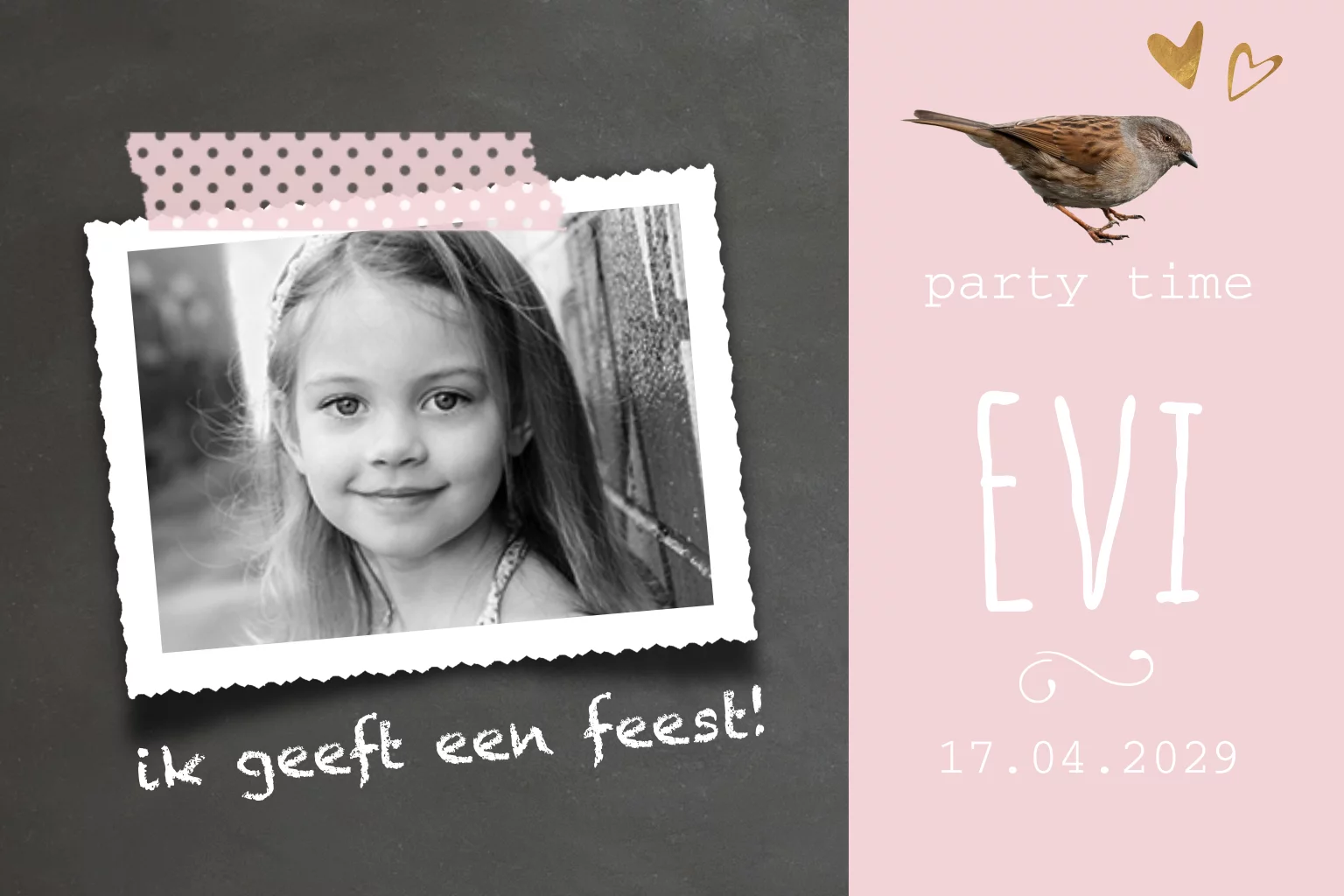 Uitnodiging kinderfeestje meisje roze krijtbord en foto