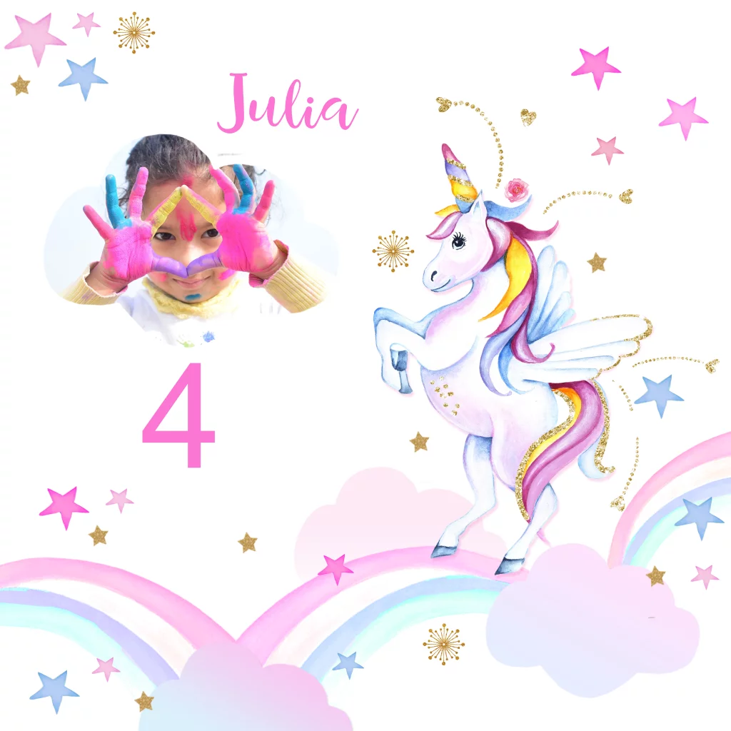 Uitnodiging kinderfeestje unicorn eenhoorn meisje en foto