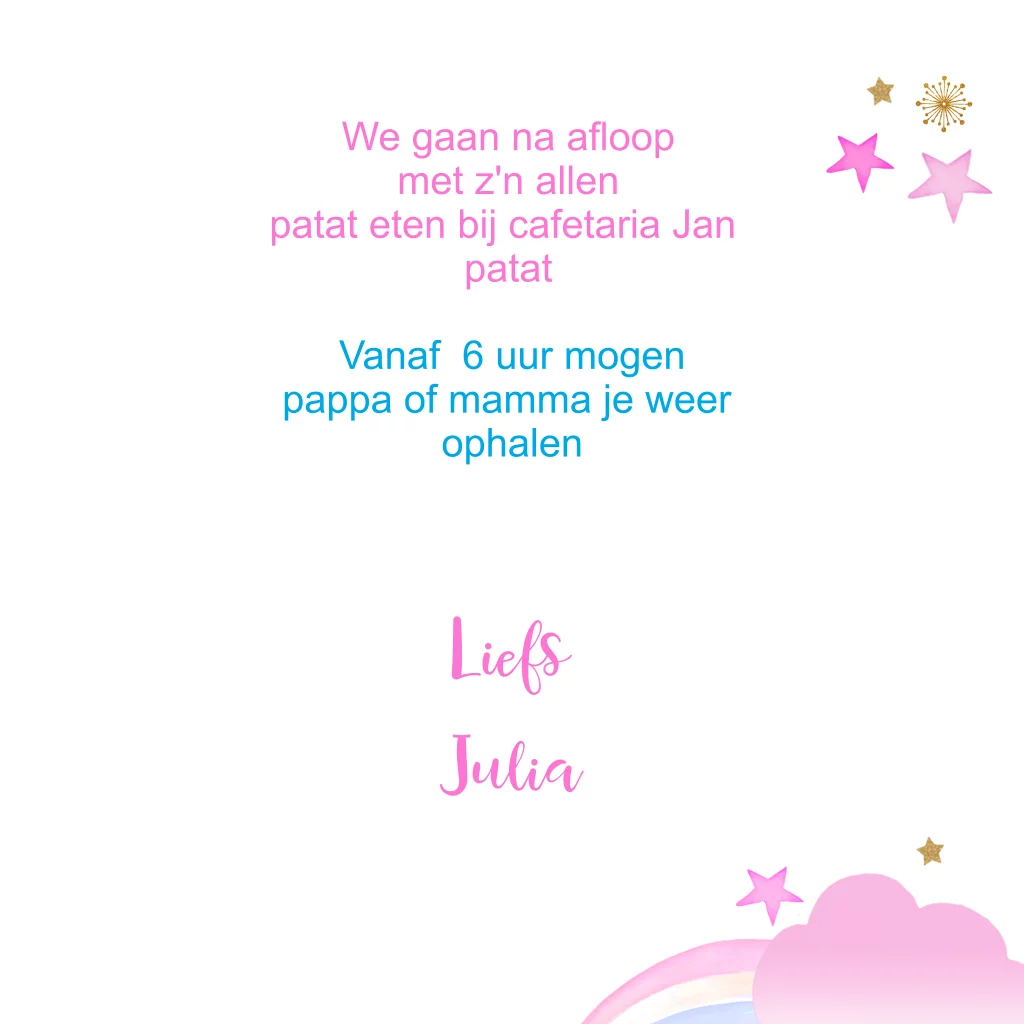 Uitnodiging voor een kinderfeestje met leuke unicorn op wolkjes en regenboogjes. (3286)