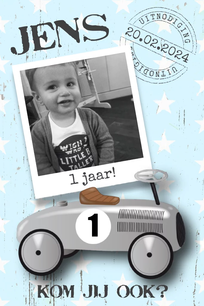 Een stoere uitnodiging met eigen foto, loopauto en sterren voor een verjaardagsfeestje! Het cijfer 1 in de loopauto kan je veranderen.