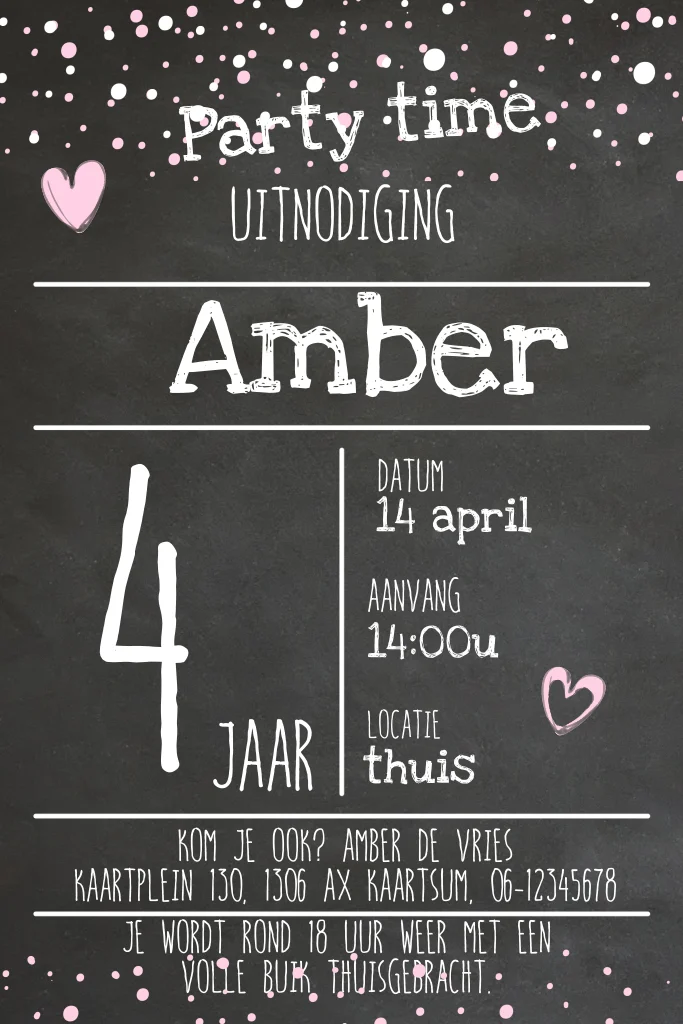 Uitnodiging meisje 4 jaar confetti en krijtbord