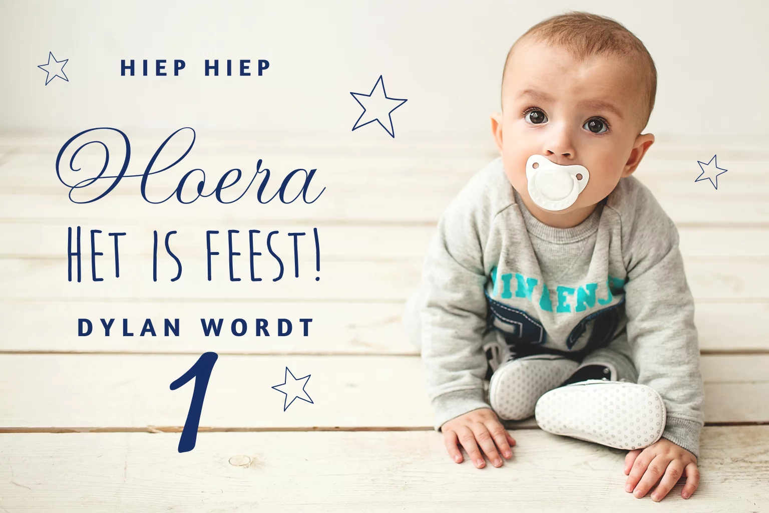Feestelijke uitnodiging voor de verjaardag van jouw zoontje met een foto en sierlijke typografie.