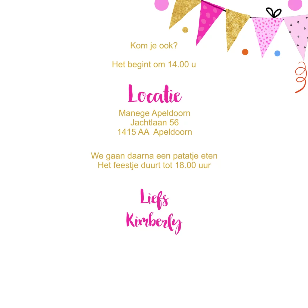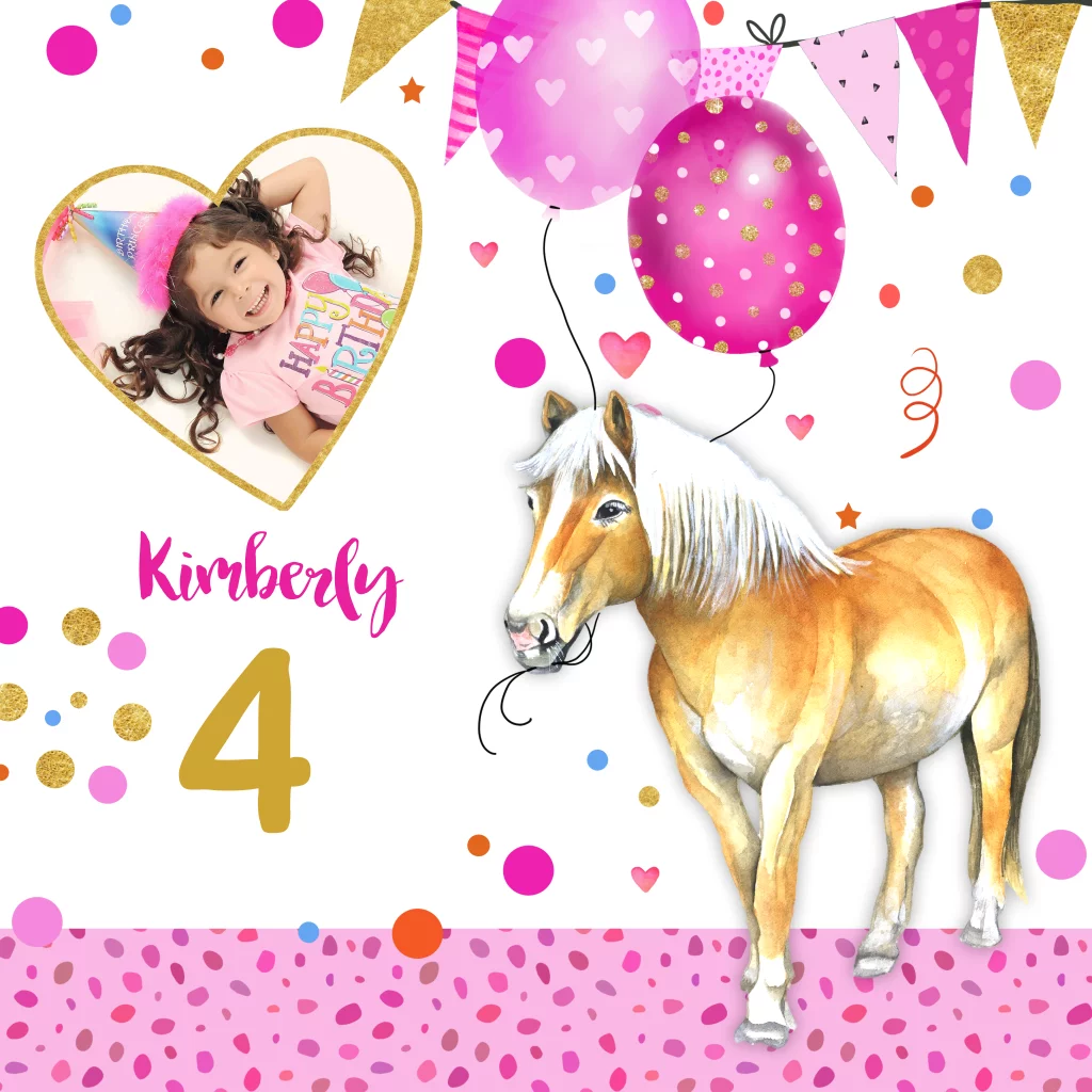 Uitnodiging voor een Verjaardagsfeestje met een leuk paardje paard versierd met ballonnen en confetti