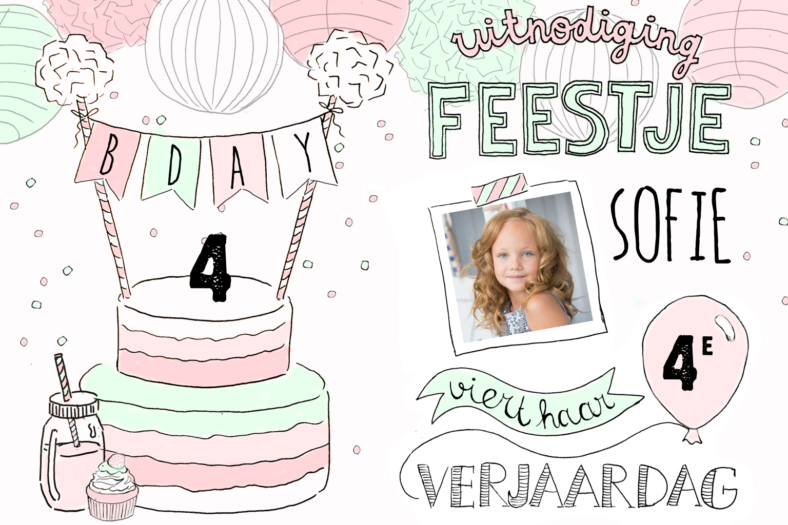 Een leuke, hippe uitnodiging met een getekende taart en sierlijke letters voor een kinderfeestje. Het ziet er zo feestelijk uit met de verjaardagstaart, de vlaggetjes, de ballon en het kleine cupcakeje!