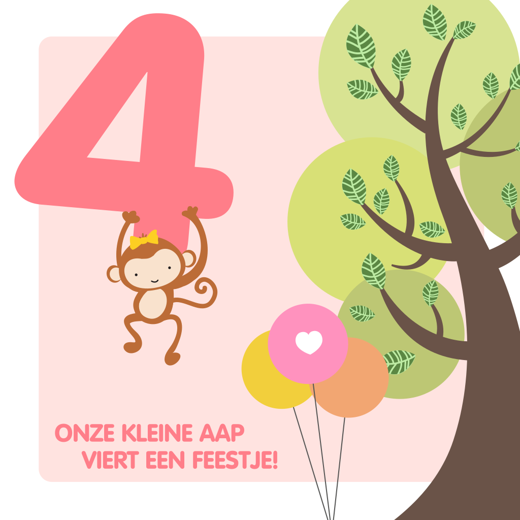 Lieve uitnodiging voor de verjaardag van een meisje met illustraties van een aap, boom en ballonnen.