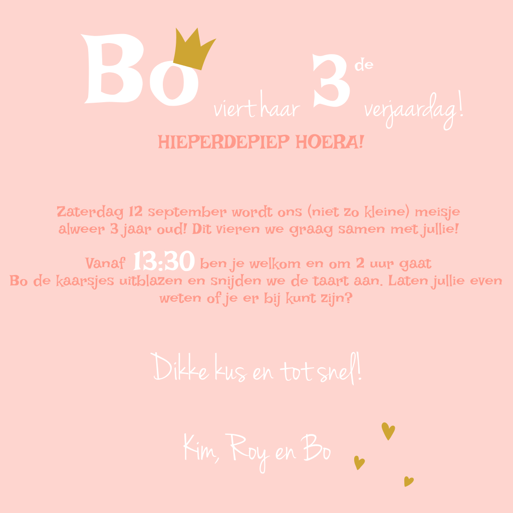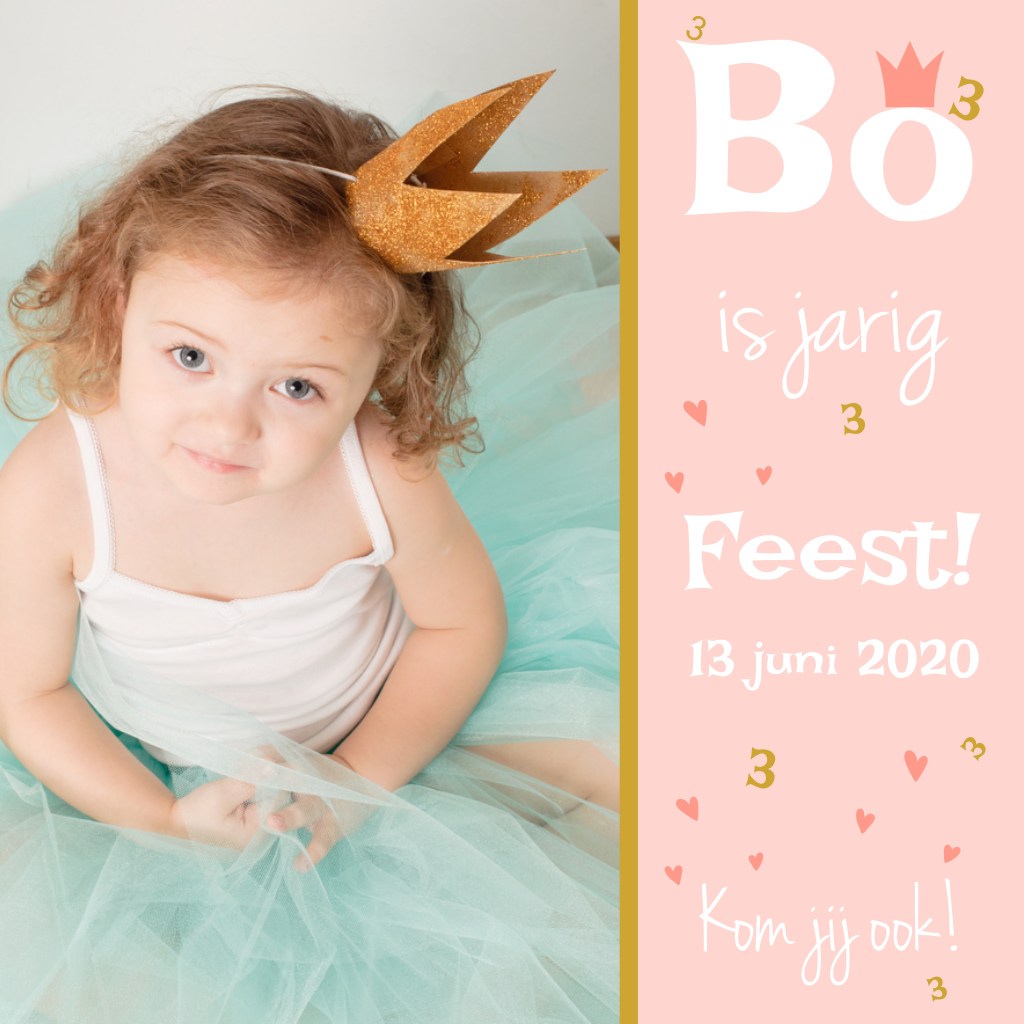 Lieve uitnodiging voor de verjaardag van jouw dochtertje. Plaats je eigen foto op de roze achtergrond met hartjes.