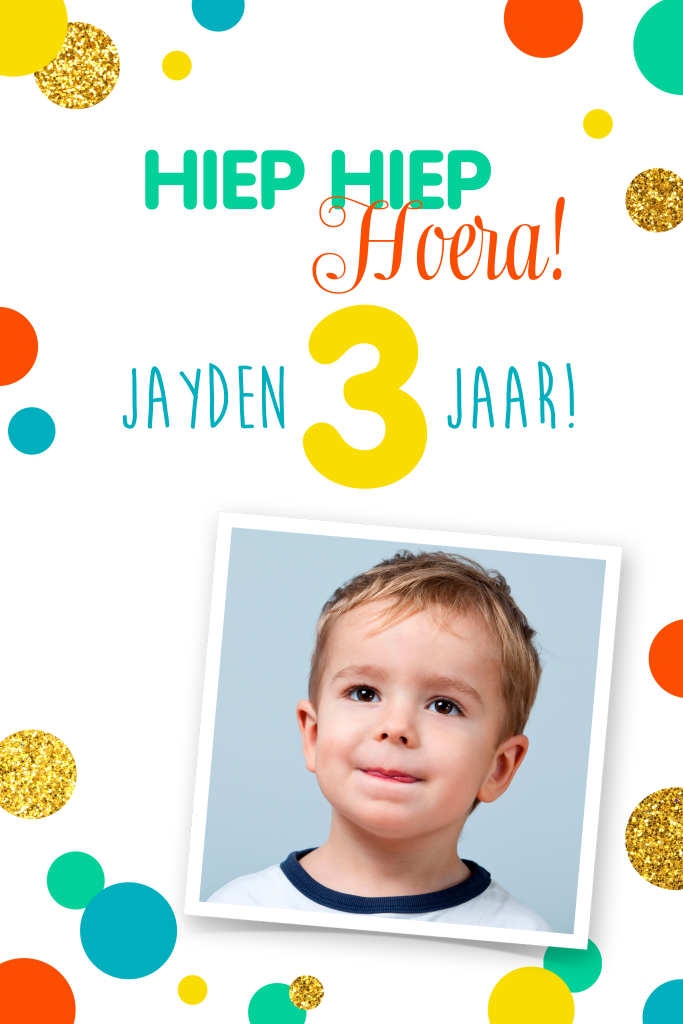 Vrolijke uitnodiging voor de derde verjaardag van je zoontje. Plaats een eigen foto tussen de kleurrijke confetti.