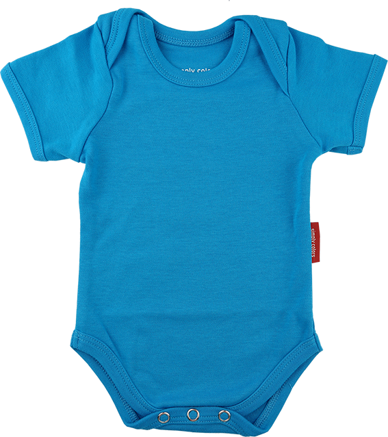 Rompertje in helderblauw met naam en geboortedatum.