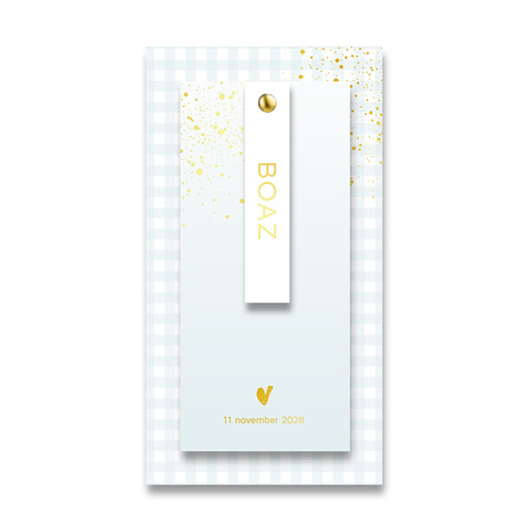 Een klassiek geboortekaartje voor een jongen met blauwe ruit en echt label. Je kunt de kaartjes bevestigen door middel van een leuke splitpen.