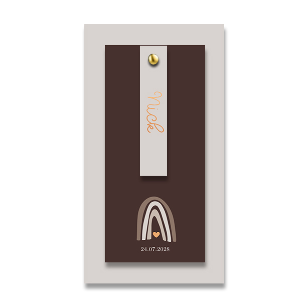 Geboortekaartje label jongen of meisje met een regenboog. Een kaartje met echt label. Je kunt de kaartjes bevestigen door middel van een leuke splitpen.