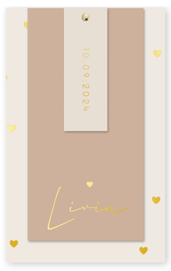 Lief label geboortekaartje voor een meisje met hartjes en warme aardetinten. Je kunt de kaartjes bevestigen door middel van een leuke splitpen.
