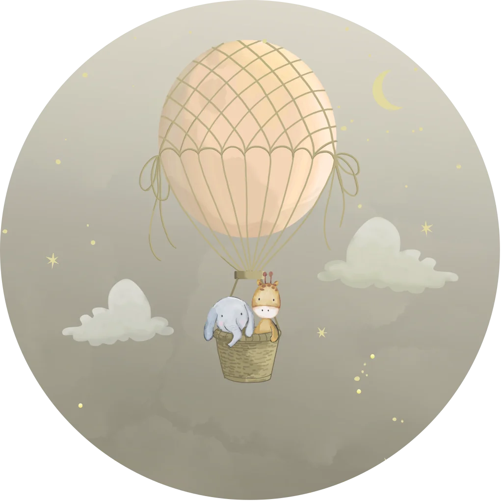 Muursticker voor een meisje met een luchtballon met olifantje en giraf tussen de maan en sterren. Een magisch ontwerp uit de collectie 'winterliefde'.
