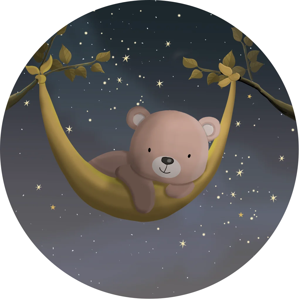 Muursticker voor een meisje of een jongen met een lief beertje in een hangmat onder een sterrenhemel. Een magisch ontwerp uit de collectie 'winterliefde'.