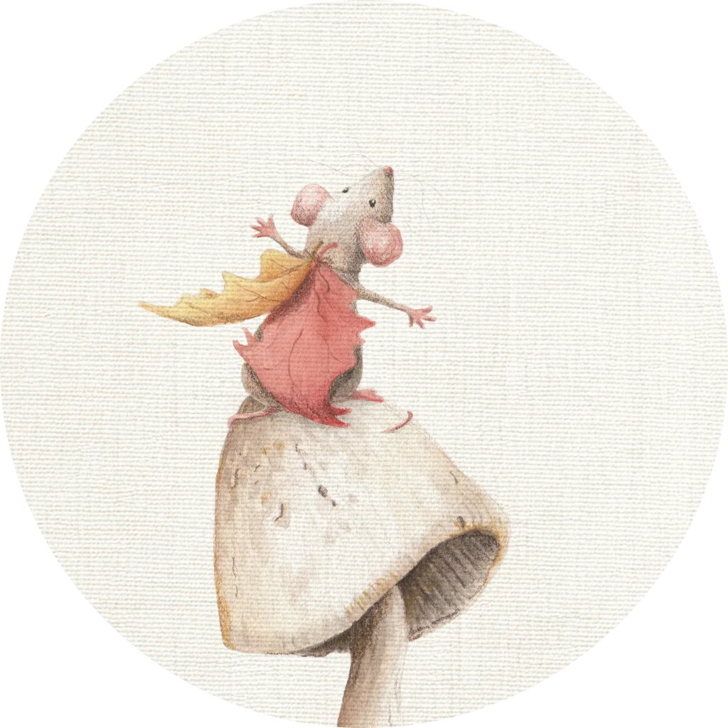 Een sluitsticker of naamsticker met een muisje op een grijze paddestoel. Gebruik deze om je geboorteaankondiging compleet te maken of om je bedankjes persoonlijk te maken.