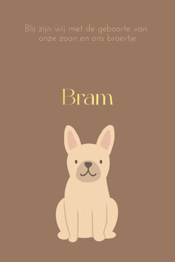 Een origineel geboortekaartje met een schattige hond en een speels doorkijkje in bruinβ en beige tinten. De bijzondere gestanste vorm geeft het kaartje een unieke uitstraling. Pas het ontwerp eenvoudig aan naar eigen wens in onze online editor. Uit de speciale huisdieren collectie 'Thuis is met jou πΎ.