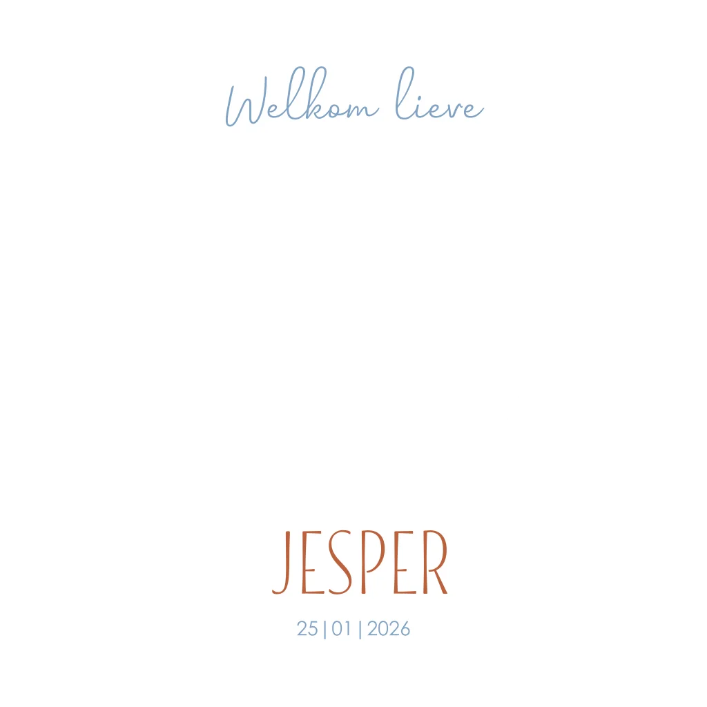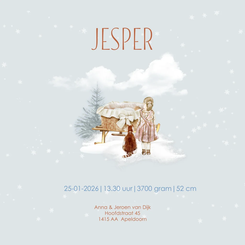 Een geboortekaartje voor een jongen met een zusje en een kat en hun slee in de sneeuw. Het ontwerp heeft een winterse en speelse uitstraling. Pas het ontwerp aan in onze online editor.