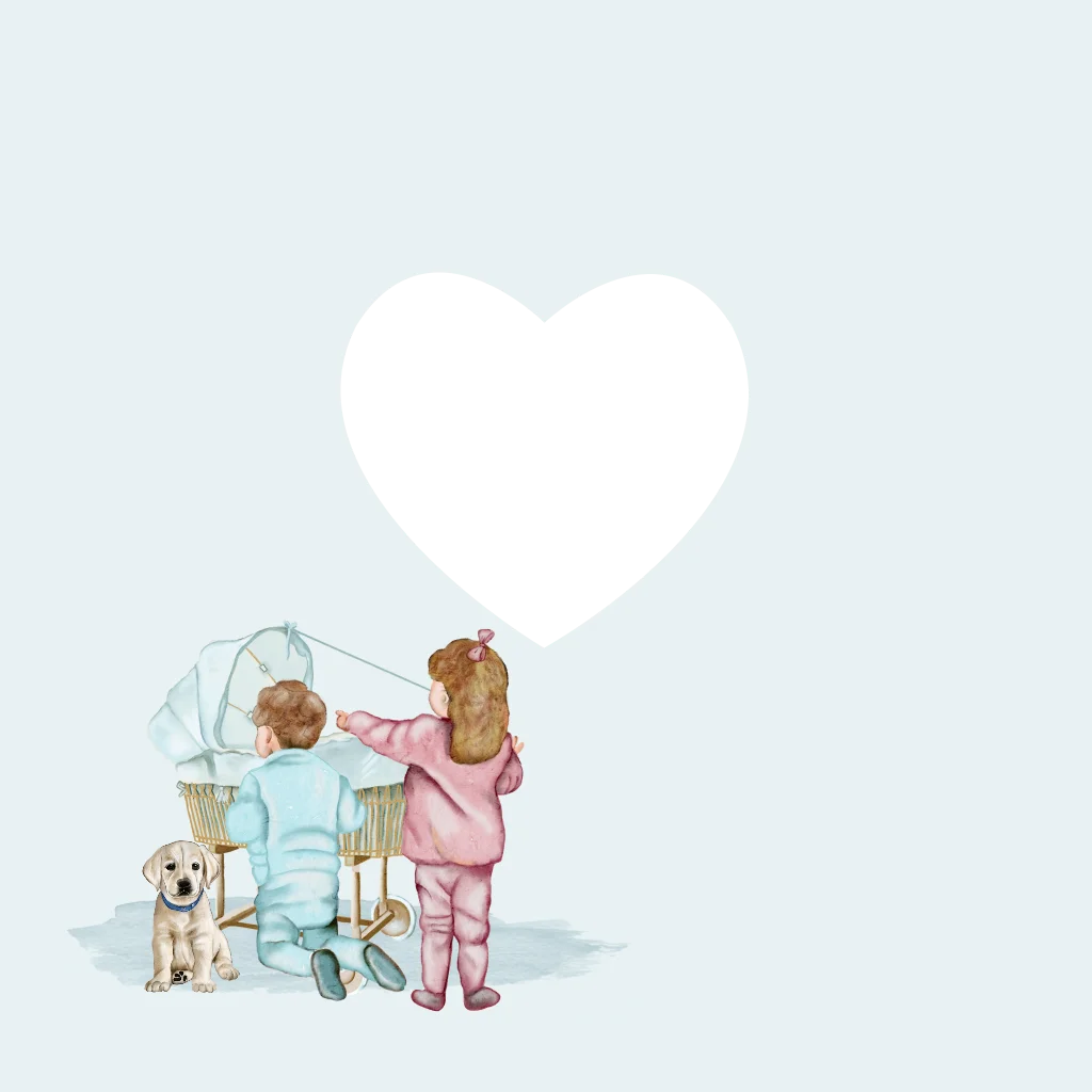 Een lief blauw-groen geboortekaartje voor een jongen in stansvorm, met een wiegje, grote zus en trotse broertje samen met een vrolijke hond. Pas het ontwerp eenvoudig aan in onze online editor.