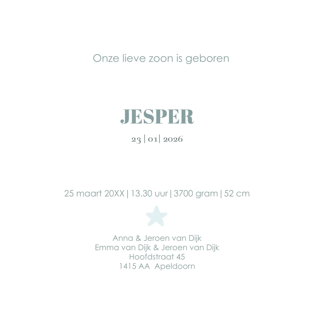 Lief blauw-groen geboortekaartje voor een jongen met zusje, broertje en hondje.