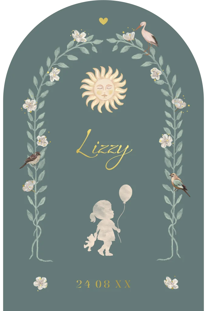 Een tof meisjeskaartje met een ronde bovenkant en de naam in goudfolie. Mooie illustraties van gebogen takjes met bloemen en vogeltjes, een ooievaar en een waterverf silhouet maken dit kaartje super mooi en origineel voor een klein meisje. Pas de kleuren zelf aan. Verwacht je een jongetje neem dan contact met ons op.