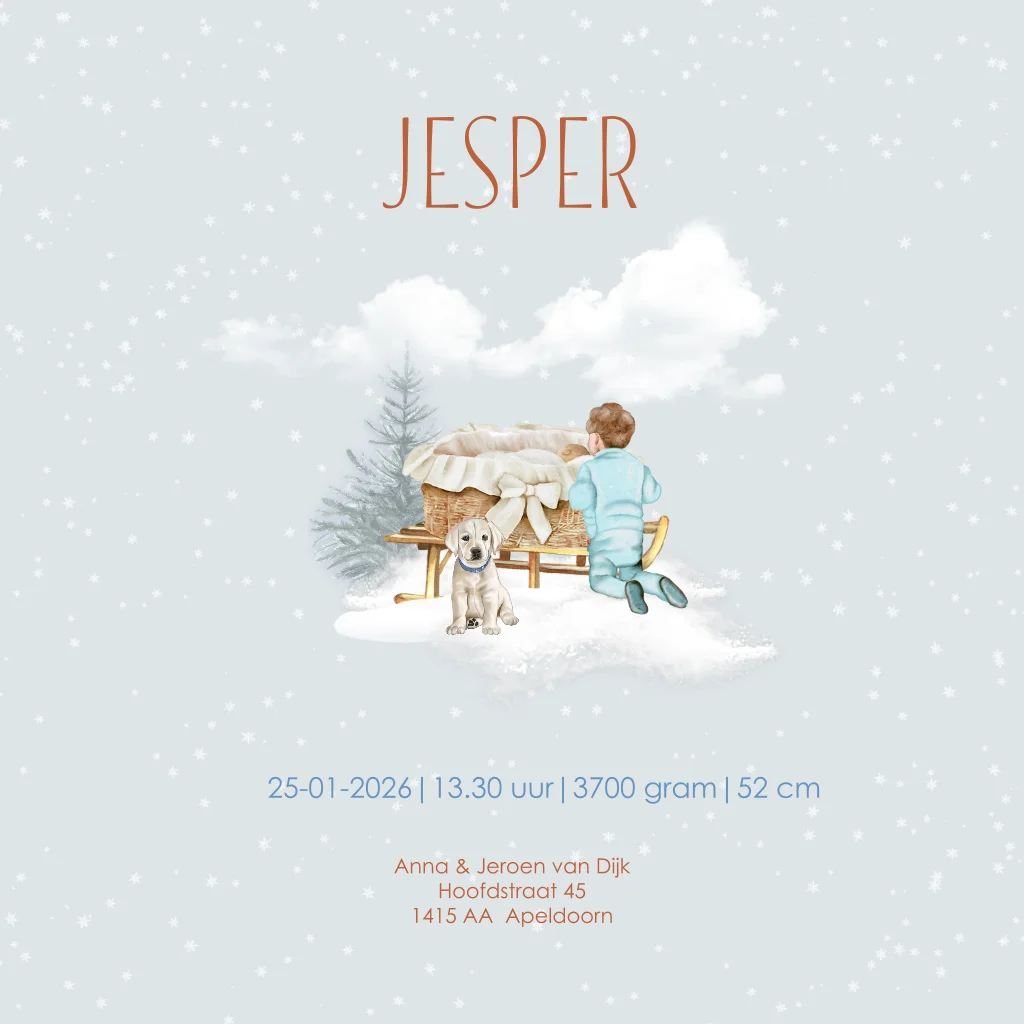 Een geboortekaartje voor een jongen met een slee in de sneeuw, samen met zijn broertje en een hondje. Het ontwerp heeft een frisse, winterse uitstraling. Pas het ontwerp aan in onze online editor.