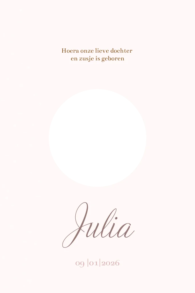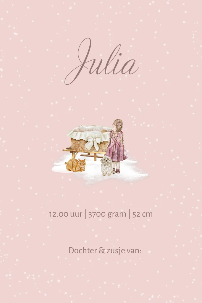 Roze geboortekaartje voor meisje met zusje, een mandje en huisdieren