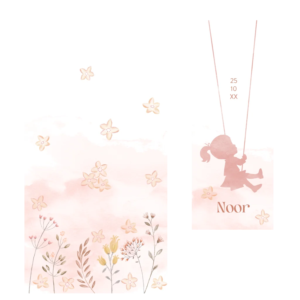 Een lief geboortekaartje wat bestaat uit 2 delen. Op het bovenste kaartje staat een watercolour silhouet van een meisje op een schommel. De kaartjes kun je aan elkaar bevestigen met een leuke paperclip of lintje die je ook via onze site kunt bestellen. Zo kan het kaartje echt schommelen. Pas het ontwerp eenvoudig aan naar eigen wens in onze online editor.