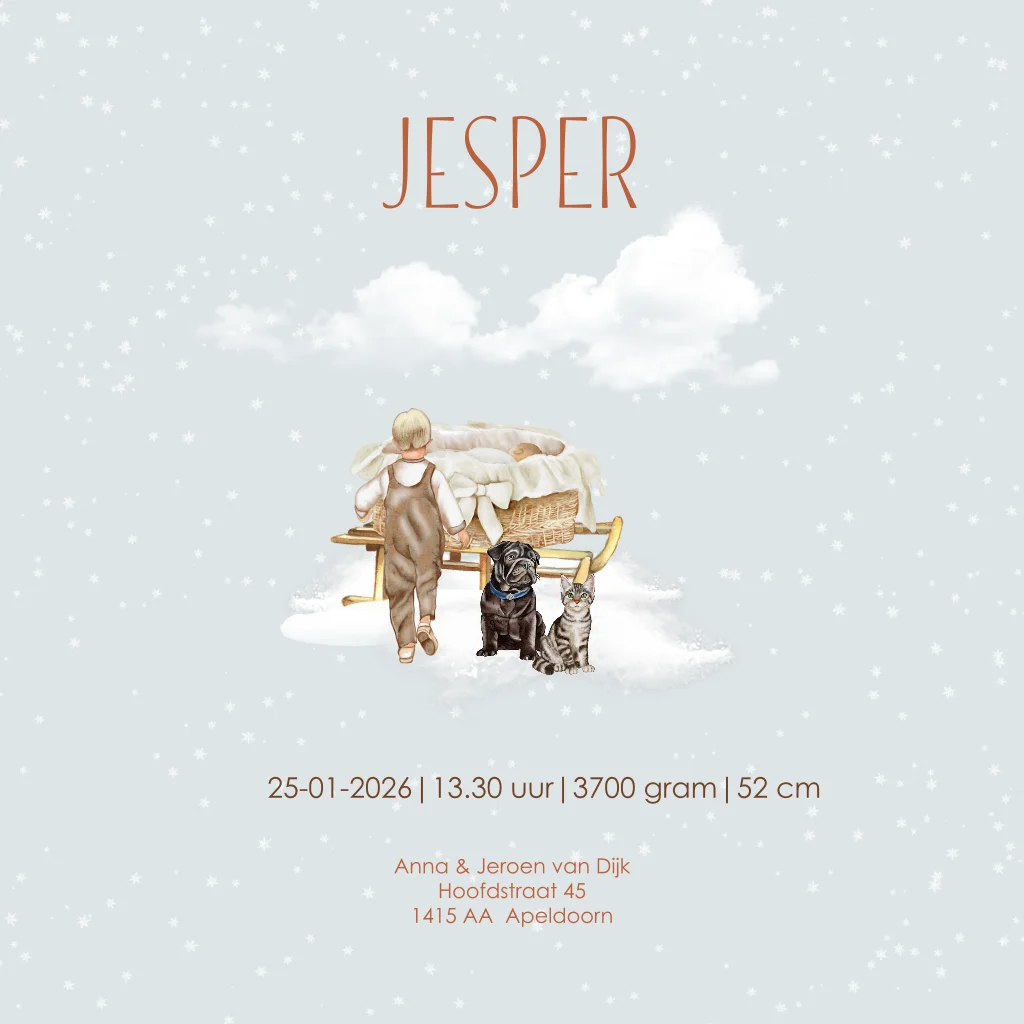 Een vrolijk geboortekaartje met hoogglans van een jongen met een slee en zijn hond en kat. Pas het ontwerp aan in onze online editor.